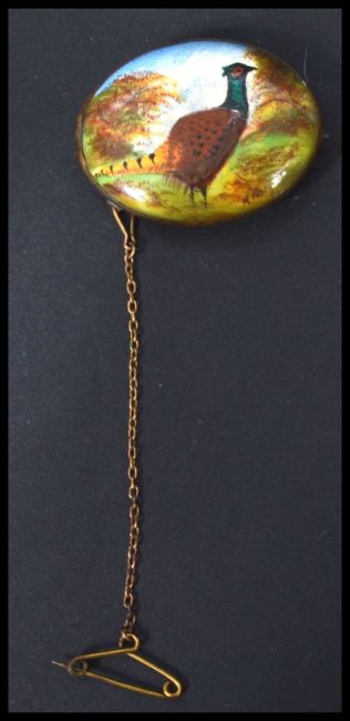 A vintage 20th century painted porcelain brooch, depicting a pheasant in the manner of A. H. Wright. Measures 4 cm wide.