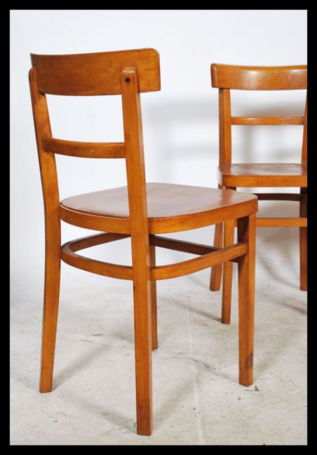A retro mid century tubular metal and yellow formica kitchenette dining table together with a set of 4 mid century beech wood utility style dining chairs with panel seats and upper peripheral stretchers. Measures: 79cm high x 40cm wide x 44cm deep.