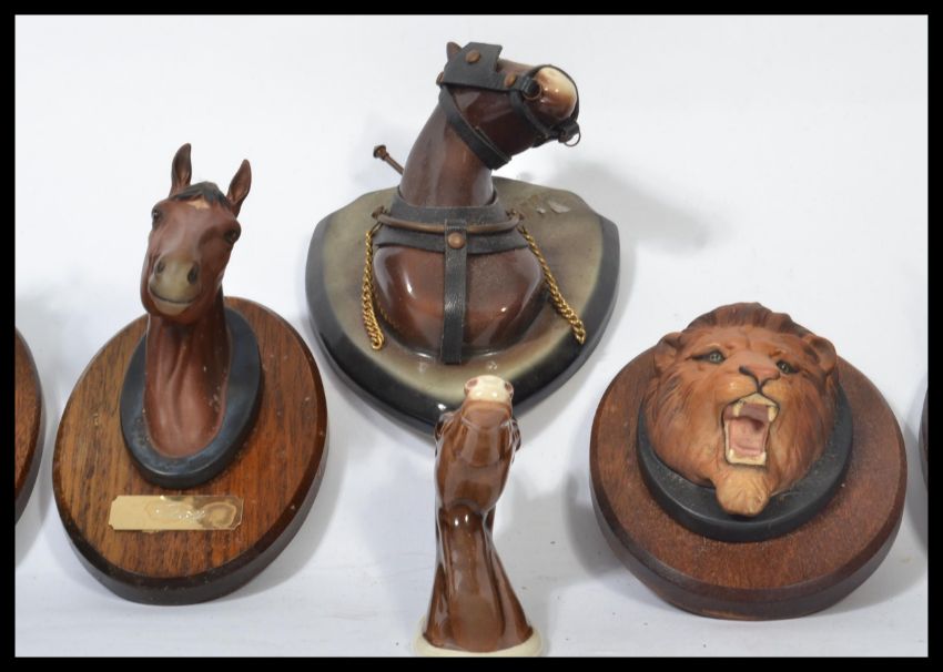 A large collection of Beswick horse wall plaques along with a Beswick lion wall plaque. Includes Troy , Red Rum , Minstrel , etc. (11) along with a statue bust of a horse. Longest measures 19 cm.