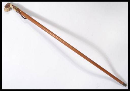 A vintage 20th century walking stick cane having a tapering wooden shaft with brass collar and the handle in the form of a Airdale dog. Measures 98 cm long.