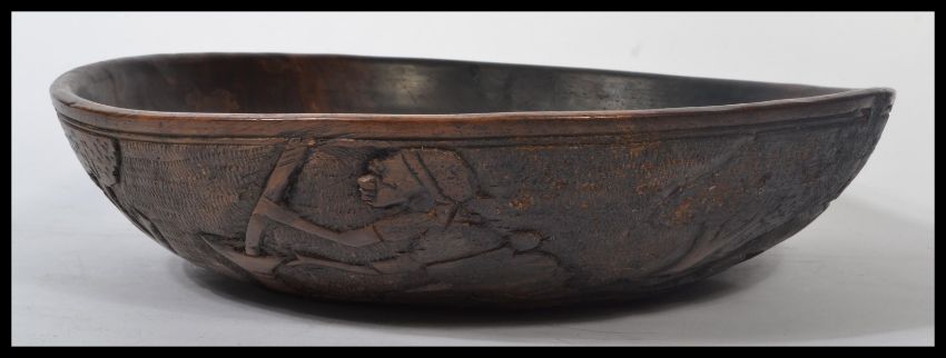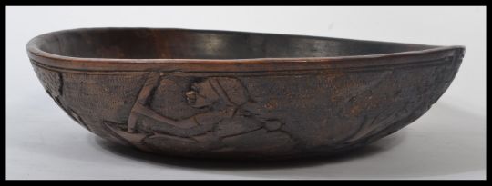 An early 20th century carved African tribal art bowl depicting scenes of figures people , buildings , dog etc. Measures 11 cm high and 46 cm diameter. Appears in good order with no visible major damage some ware to base. Please see images.