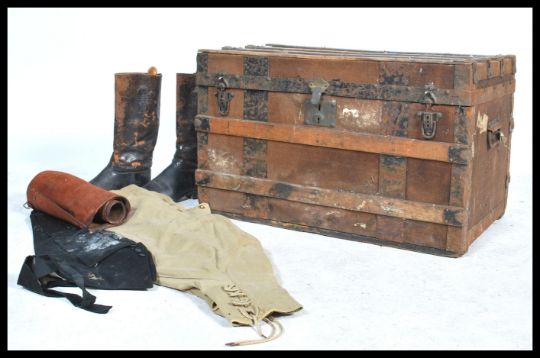 A vintage early 20th century diddy box pertaining to a Vice Admiral containing various clothes with labels and names. The trunk of wooden and brass bound construction with various locks and an inner tray. Please see images. Measures: 44cm high x 71cm wide x 42cm deep.