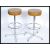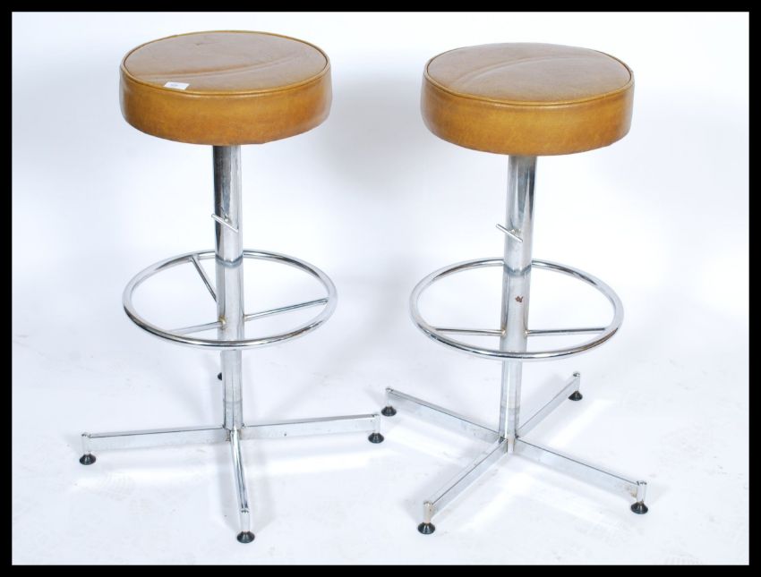A pair of retro 1970's chrome and faux mustard / tan leather adjustable bar - kitchen stools with peripheral strechers, rise and fall columns with stunning pad button back seats atop