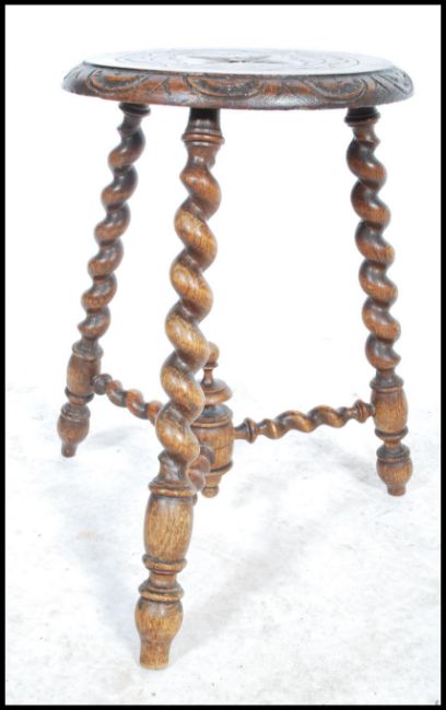 An early 20th century oak milking stool having a profusely carved ornate seat pad.