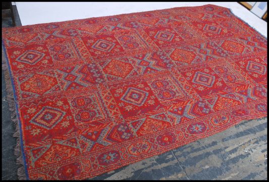 A large Oriental Shiraz style carpet - rug having red ground with multiple medallions with geometric decoration and borders etc. Measures 260cms x 172cms