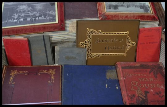 Solid Leather large antique suitcase with various Victorian/Edwardian effects (photographs, paperwork, souvenirs, scraps, book). Also framed & glazed signed oil painting.