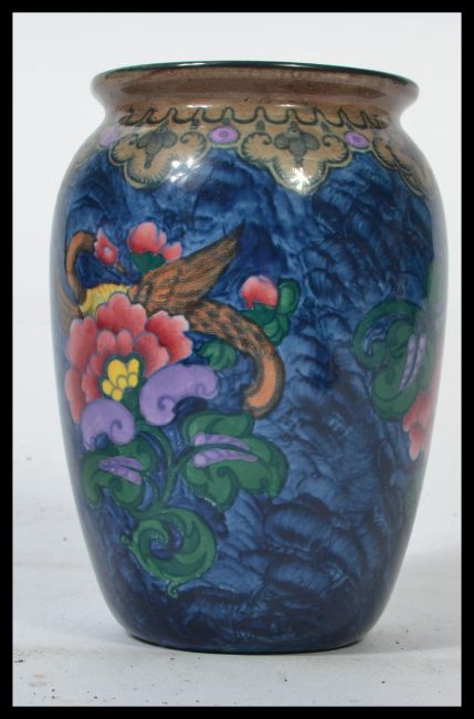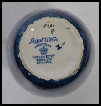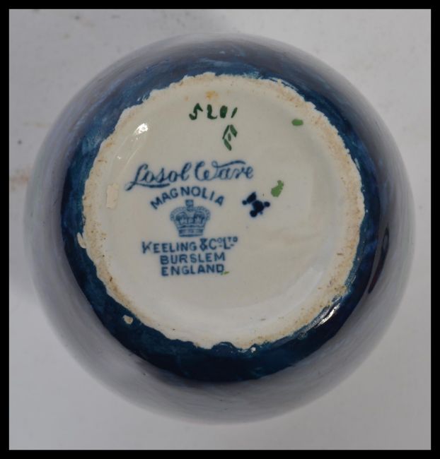 An early 20th century Losol Ware Magnolia pattern bulbous vase with blue glaze and magnolias to centre. Measures 16 cm high.