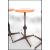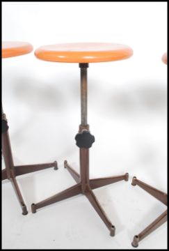 A set of four vintage 20th century retro stools having orange circular tops raised on adjustable tubular stems with a quadruped bases. 61x36cm