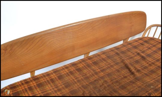 An original Ercol 1970's day bed sofa settee complete with the original cushion. Light beech and elm construction stood on tapering legs with bar back rest and gallery surrounds
