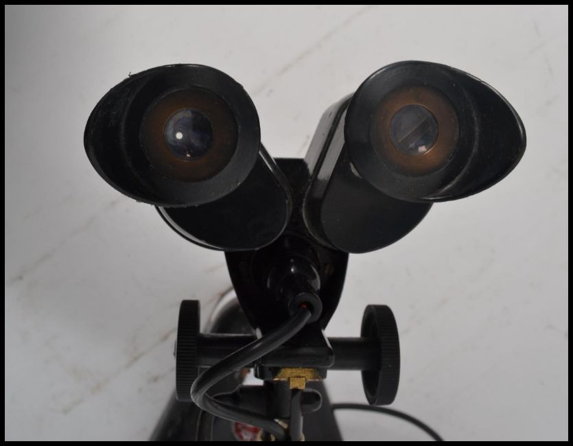 A vintage mid century opticians eye glass magnifier lamp by Cooke & Yorke. Ebonised with weighted base having eye scopes that adjust with working lamp. Ideal as a table lamp. 40cm