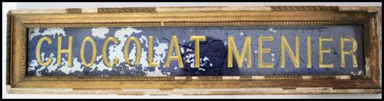 An early 20th century glass shop sign for ' Chocolat Menier ' The rectangular sign with gilded recessed notation, remains of blue paint. Set to gilt plaster wooden frame. 53x12cm