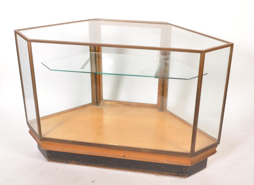 A good early 20th century circa 1920's bronze mounted shop display counter - haberdashery counter possibly by E.Pollard & Co with parquet floor interior  being raised on a plinth base 92x135x62cm.