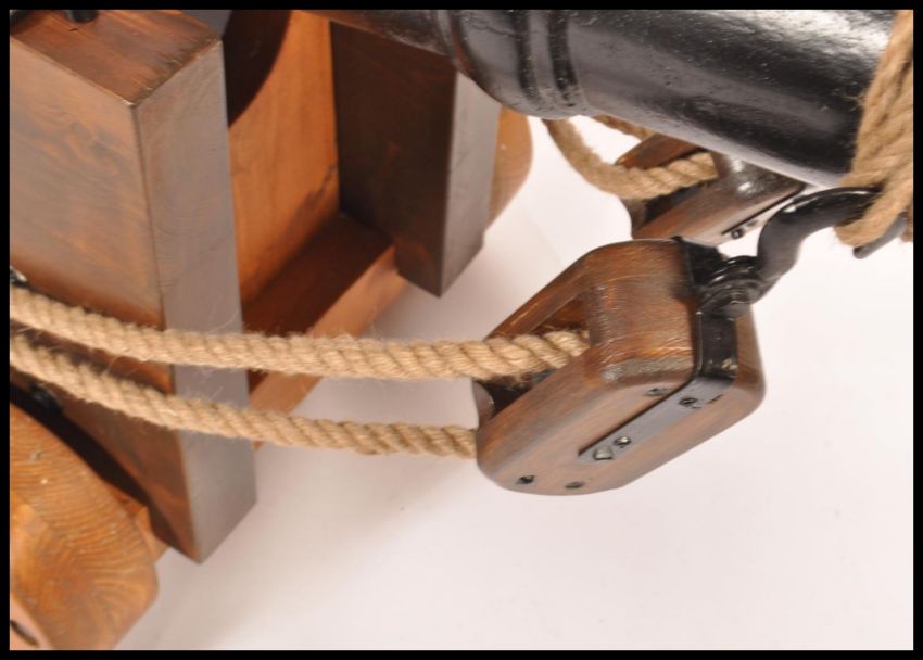A full sized English Naval Napoleonic replica cannon 4 / 6lb set on wooden carriage. The barrel is cast metal and painted with crested top. Formed from a robust composite concrete mould creating the hollow steel core. Hand made individually by local Bristol craftsman who has only ever made 3 in total. Specifications Length 69"  / 175cms , Bore 3" / 70mm, weight 196lb / 96kg