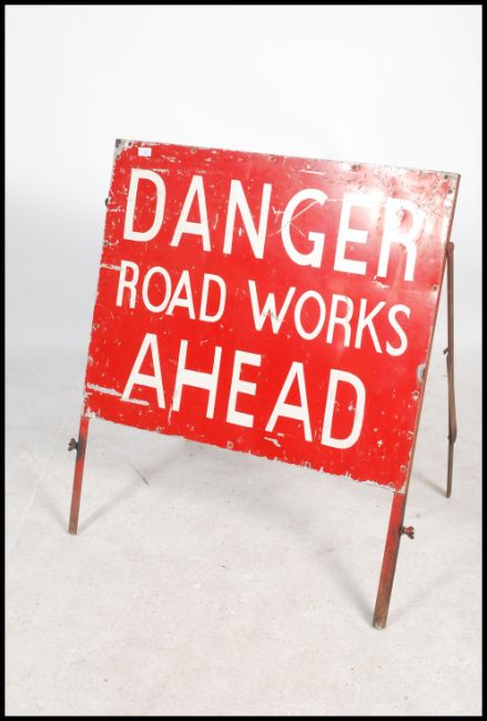 A 1960's enamel Industrial road sign. The red painted sign with red ground and white notation for ' Danger Road Works Ahead ' Set to the original A-Frame