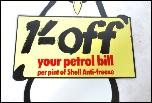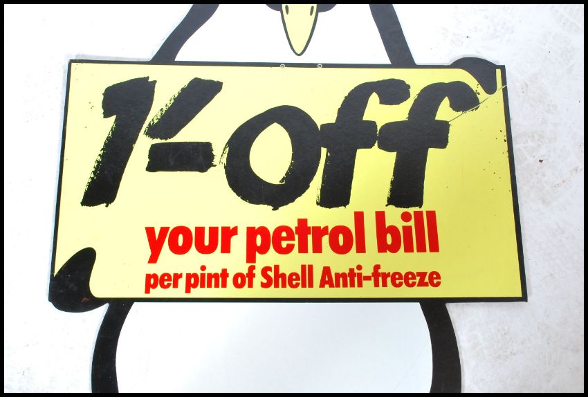 A vintage 20th century Shell advertising board in immaculate never used condition. In the form of a penguin with notation to centre. The wooden board with painted front.