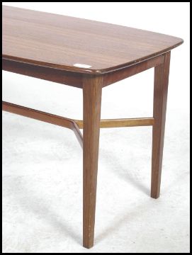 A 1960's mid century teak wood coffee table raised on tapering legs with an x-frame stretcher, Reeded edge rectangular top above in the manner of Robert Heritage for Archie Shine