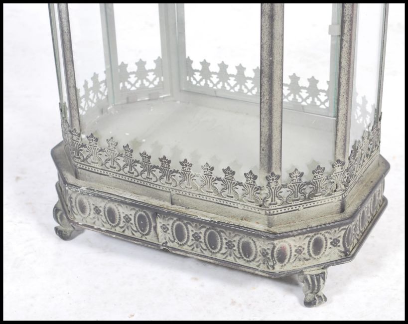 An unusual 20th century large aged metal Indian porch lantern for candles. Intricate pierced frame with details having large glass panels with hook atop. 73x34x23cm.