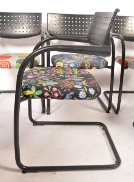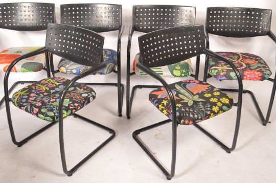 A set of 6 Vitra Chaira. Circa 1986, the original original Blue fabric still on the chair but covered with  fabulous Marrimeko coloured Fabric.