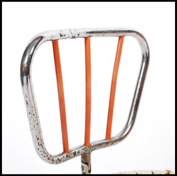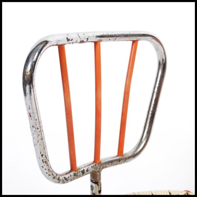 A mid century, circa 1950's chrome and plastic rattan folding apprentice piece chair. The small chair - raised on chrome tubular legs with folding back rest and rattan plastic red and white strapping. 52cm.