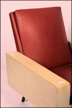 After Joseph-André Motte - A pair of 1960's two tone crimson red and ash grey leather type wedge chairs in geometric form with straight and angular lines raised on metal legs