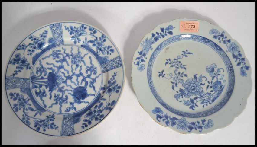 Two 18th century Chinese blue and white cabinet plates having hand painted blue and white decoration depicting floral sprays with geometric borders.