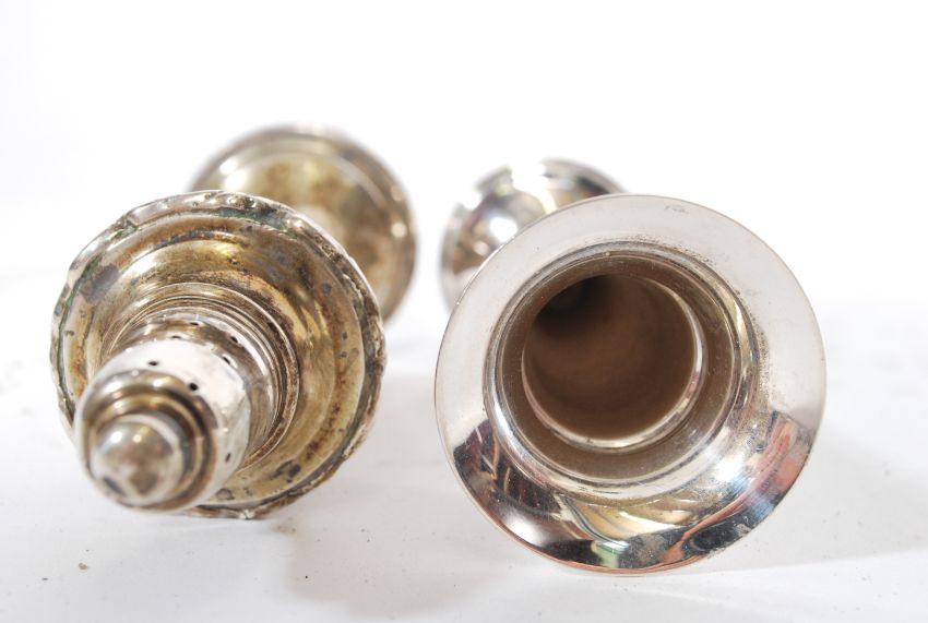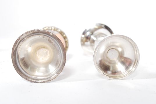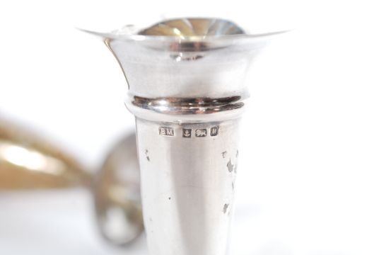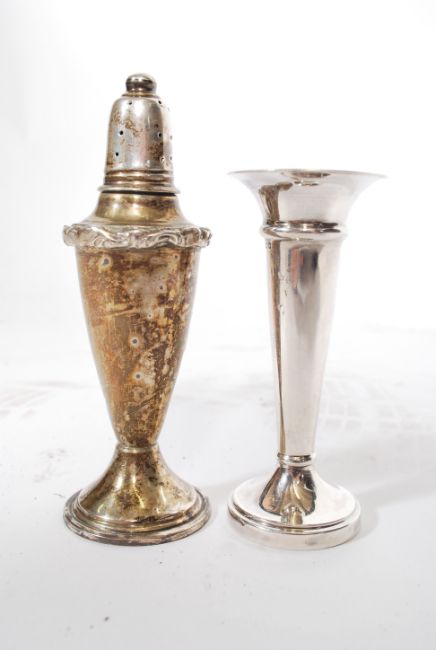 A silver hallmarked solifleur single stem vase by Birmingham Mint, date Letter M for 1986 together with a pepperette being unmarked and stamped illegibly 925 to the base. Total weight combined 96g