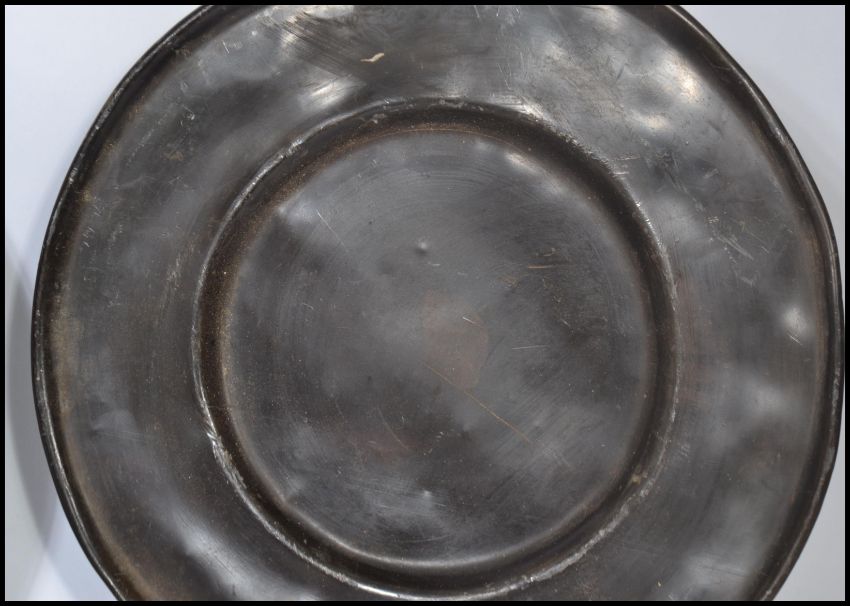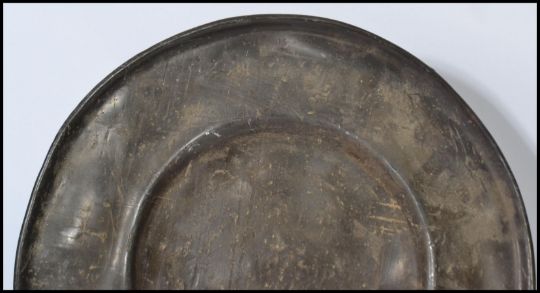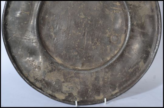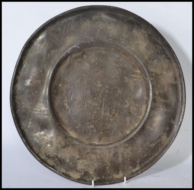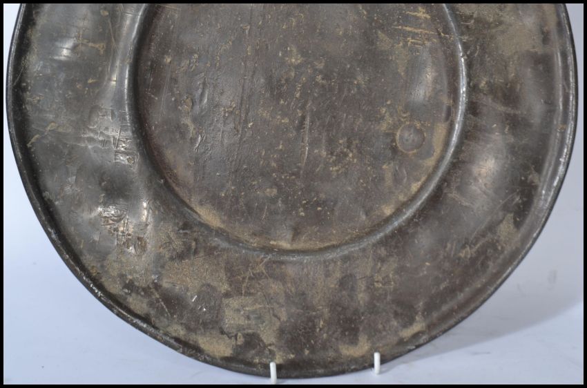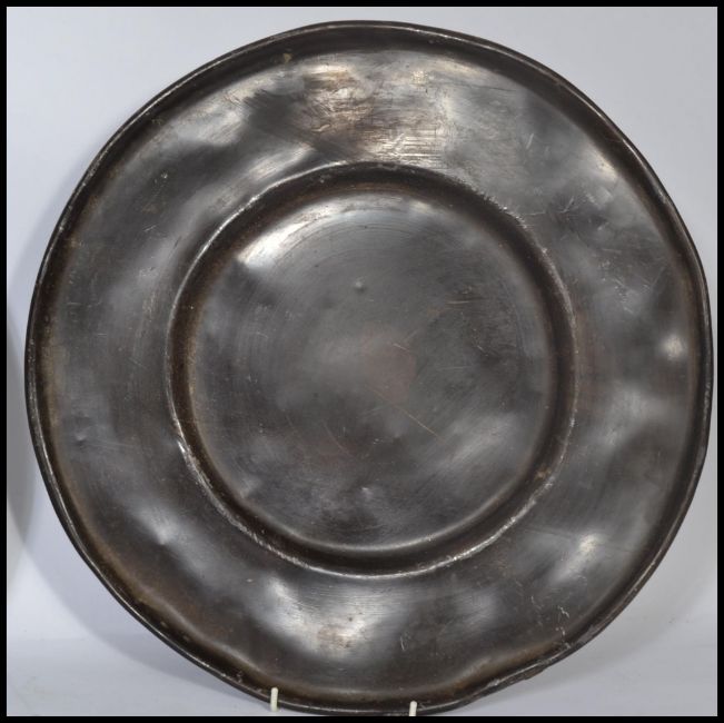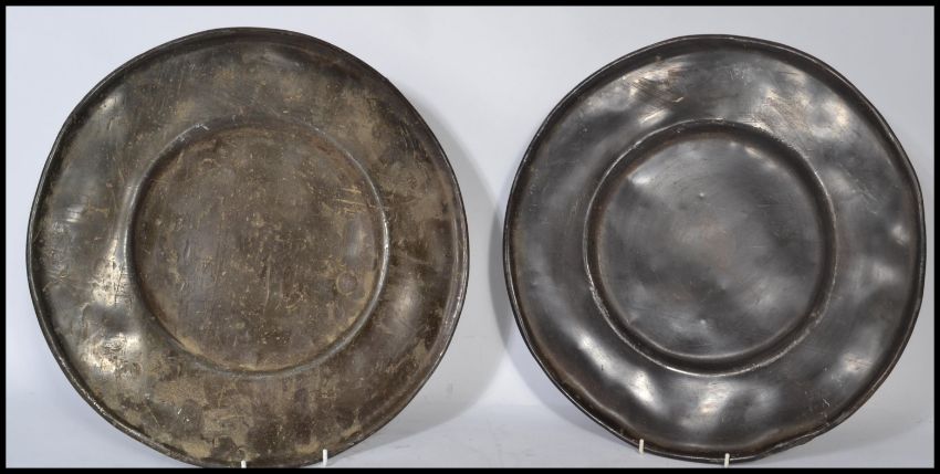 A pair of 18th century lead / pewter dinner plates, the plates of usual form with no noticeable touch marks. Measures 41 cm diameter.