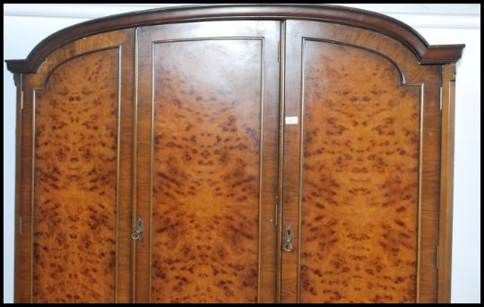 A Queen Anne revival triple wardrobe compactum in burr walnut being raised on cabriole legs with pad feet. Above a triple section with double hanging robe , haberdashery drawers to the other section. Finished with a dome top. Measures 200cm x 53cm x 56cm.