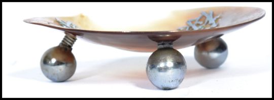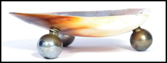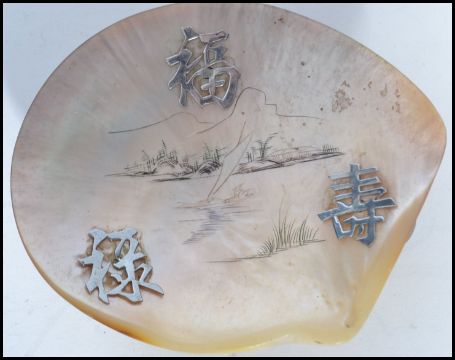 A 19th century Chinese silver and mother of pearl salt / trinket dish raised on three ball feet with silver Chinese lucky characters.