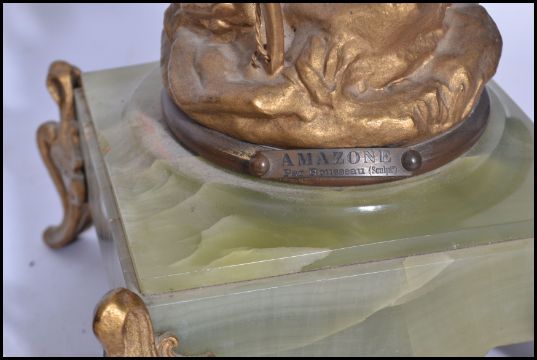 A 19th century clock and garniture set raised on green marble bases with ormolu detailing. The garniture's modelled as Archen and Amozeen with a large gilt figurine to the clock. The clock decorated with columns and scrolls with the enamel face having an Arabic numeral chapter ring with faceted hands.. Highest measures 69cm.