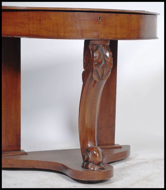 A Victorian mahogany Duchess console table being raised on shaped front support with lower tier on bun feet having a demi lune shaped table top with hinged compartment