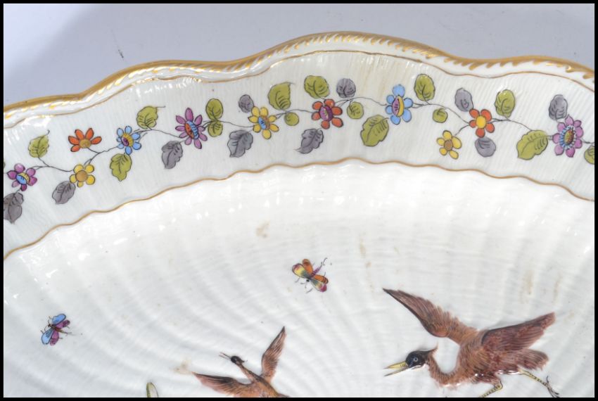 A 19th century ceramic platter meat tray depicting swans and cranes with insects. Floral sprays with gilt decoration and scrolled clam handles.Naples mark to back. Measures 48cm w x 35.5cm d.