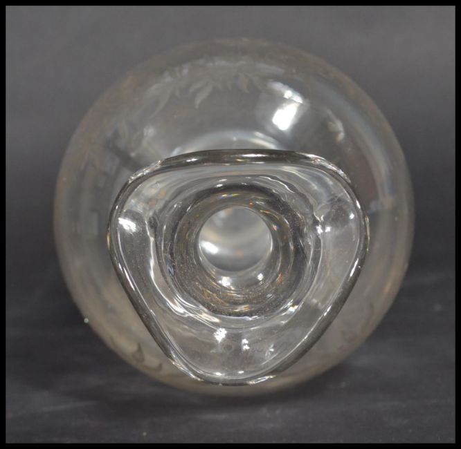 A 19th century Victorian hand blown cut glass decanter raised on a circular foot with hand engraved decoration depicting cherubs and flowers. The bulbous body having a tapered neck with flared rim. Measures 28cm high.