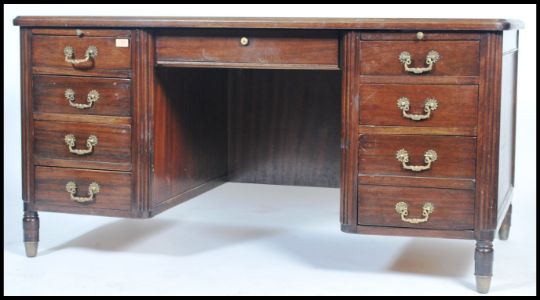 A 20th century French Empire revival twin pedestal mahogany office desk being raised on turned legs with a bank of drawers to each raised pedestal with shaped desk top above. Brass swing handles to each drawer.