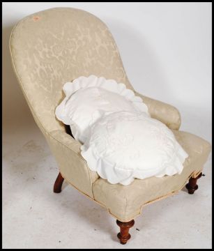 A pair of 19th century ladies and gents Victorian mahogany armchairs /  chairs, button back upholstery raised on turned mahogany supports on castors to the gents chair and upholstered in matching fabric. Measures 84cm x 68cm x 79cm.