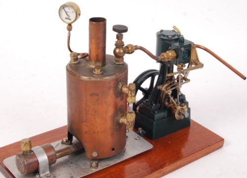 A superb Stuart single cylinder vertical engine mounted to a steam plant, with boiler. Large copper boiler fitted with a Reeves brass gauge. Complete with the burner. The Stuart engine being very well made, and appears in great condition. Green painted, with brass detailing. Presumed in full working order, but untested. Measures approx; 25cm tall x 30 wide (plinth base). Fabulous steam plant.