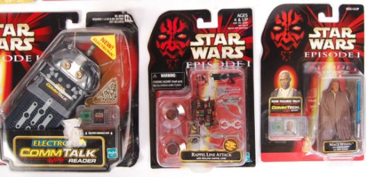 A collection of 12x Star Wars Episode One carded action figures and related items, by Hasbro. All contents appear mint and unused, all factory sealed. To include; Naboo Royal Guard, Mace Windu, Hyperdrive Repair Kit, R2D2 and others.