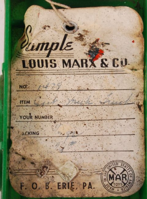 A collection of vintage Louis Marx made vehicles comprising of; 8x factory sample prototype trucks, some clockwork, with some retaining their original factory ID tags. Also to include a vintage bulldozer, bike & disassembled loose western wagon.