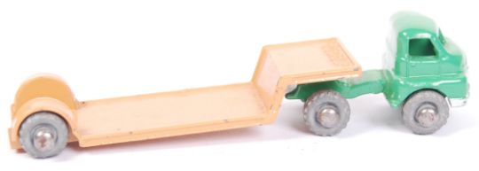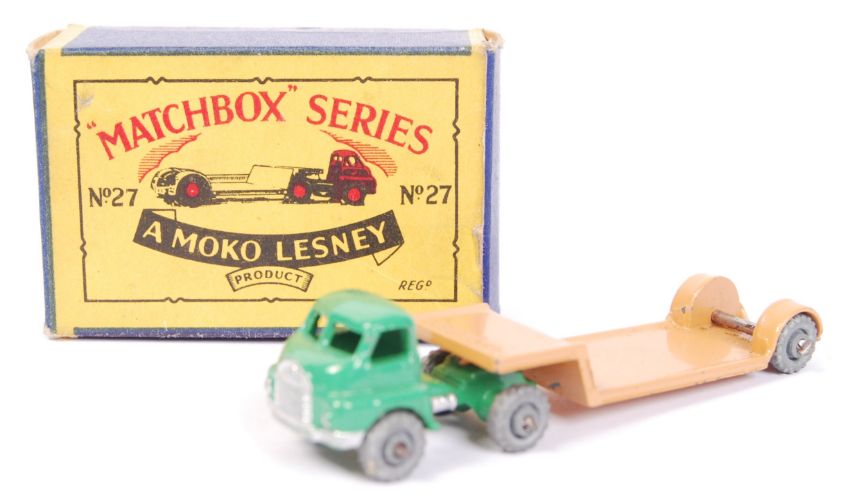 An original vintage rare Matchbox Moko Lesney boxed diecast model No. 27 ' Bedford Low Loader '. Green cab, with tan trailer and metal wheels. Model near mint, within a good original box. Rare.