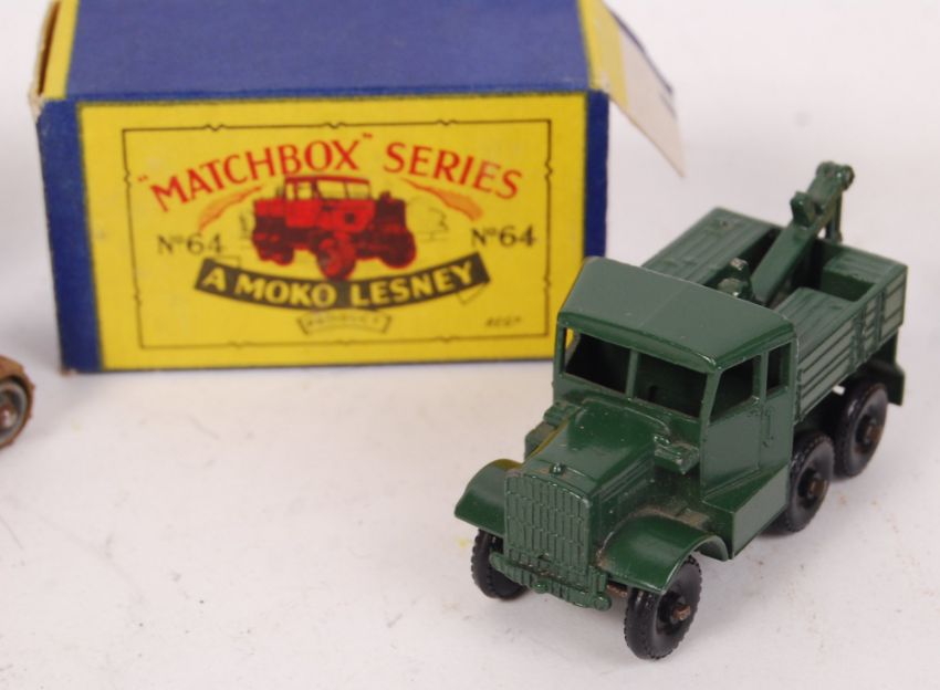A collection of 4x vintage Matchbox Moko Lesney boxed diecast models. All construction related. To include; No. 72 ' Fordson Tractor ' (blue, with orange hubs & plastic wheels - model fair to good, box good to very good), No. 18 ' Bulldozer ' (yellow, with driver. Model fair to good+, box good to good+), No. 26 ' ERF Cement Wagon ' (orange, with metal wheels. Model good to good+, box good to good+) and a military No. 64 Scammell Breakdown Truck (green. Model very good, box fair). All with original boxes.