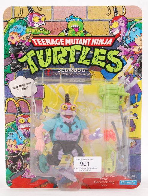 An original vintage Playmates Teenage Mutant Ninja Turtles carded 24 back action figure of  Scumbug. The figure still sealed, and unused. Unpunched.