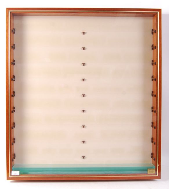 A very well made diecast model / model railway 00 gauge train locomotive display cabinet. Mahogany construction, with gilt banding to the outer edge. 9 shelves within. Fully glazed, complete with all glass shelves. Great condition.   Measures approx: H84cm x W76cm x D9cm (shelf width approx 6.5cm)