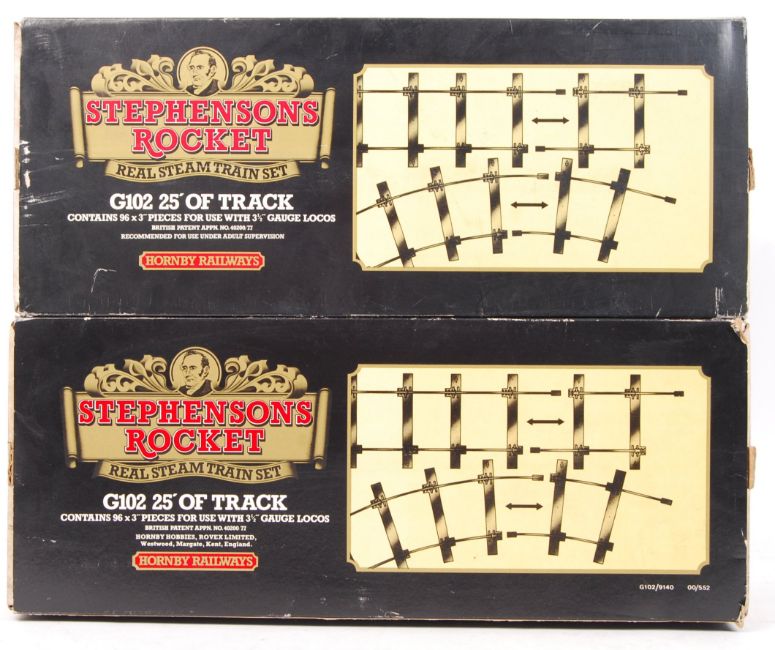 Two rare vintage Hornby Railways ' Stephensons Rocket ' G102 ' 25' Of Track '' boxed sets of train track . 3.5" G gauge / scale . Complete, within the original slipcase boxes. Rare.