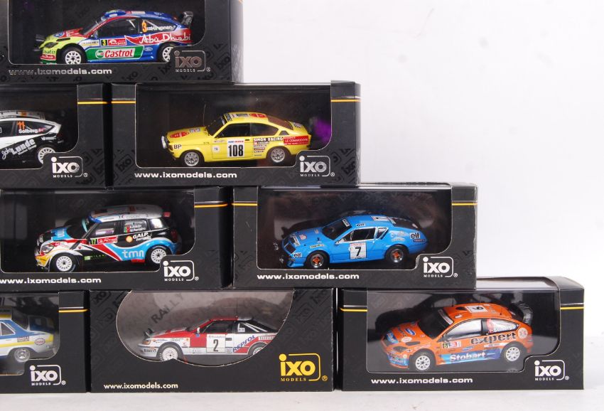 A collection of 10x IXO Models 1:43 scale precision diecast model rally racing cars to include; RAM342, RAC203, RAM471, RAM398, RAM403, RAC106, RAC163, RAC154, RAM359 & RAC139. All within their original plastic cases, with outer card sleeves. Mint.
