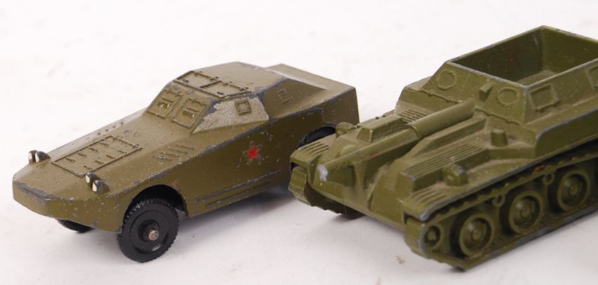 A collection of 6x assorted Post-War Russian made diecast military themed models. All unboxed, various conditions. To include; tank, Jeep, missile launcher, field gun, troop transport etc. All with Russian makers marks to underside.