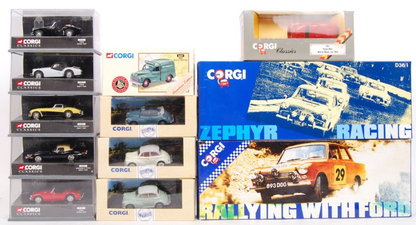 An assorted collection of Corgi Classics, gift sets & others diecast model vehicles to include; 02401, 03301, 02801, D16/1 Rallying With Ford set, 04001, 04101 & others. All within their original boxes/ plastic cases.