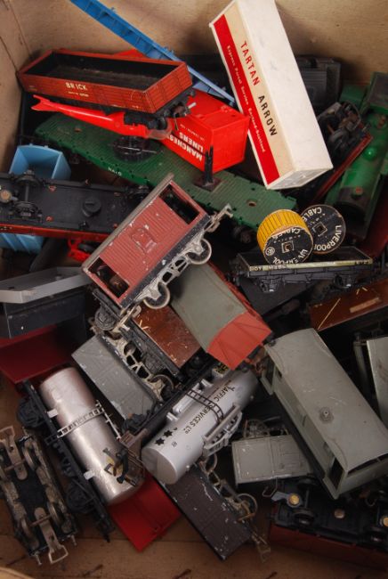 A large collection of assorted vintage 00 gauge railway trainset rolling stock carriages & wagons etc. Largely Hornby, but some other makes present ( Graham Farish, Hornby Dublo etc). Comprising of; 8x Hornby & Dublo carriages, a quantity of assorted wagons (some metal) and other accessories. Spanning 2x boxes.