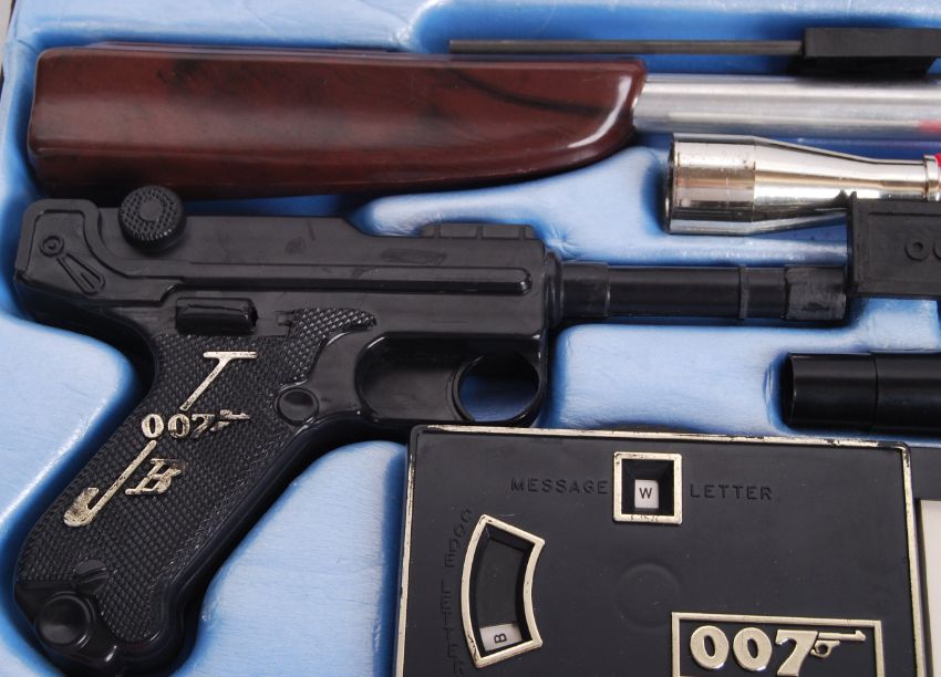 A superb rare vintage 1965 James Bond 007 ' Multiple Products ' made ' James Bond Attache Case ' playset . Incredibly rare, the attache set does appear to be complete. The playset features: Secret Agent Codebook , Code-O-Matic, Pistol , Pistol armature , Pistol Silencer , Pistol Scope , 10x rubber pellets , Commando Knife , Wallet , International Passport , 4x James Bond Business Cards and 9x bank notes. Many of these parts are very rare, and usually missing. Believed complete, minus instructions. With the original inner plastic display tray, and outer attache case present (split to top). Rare.