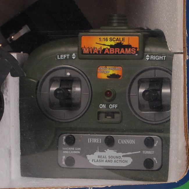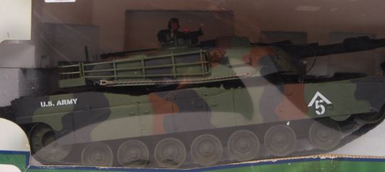A large scale R/C Radio Controlled The Discovery Store ' Battle Tank '. Appears complete, with remote, tank & power plug. Within the original box.