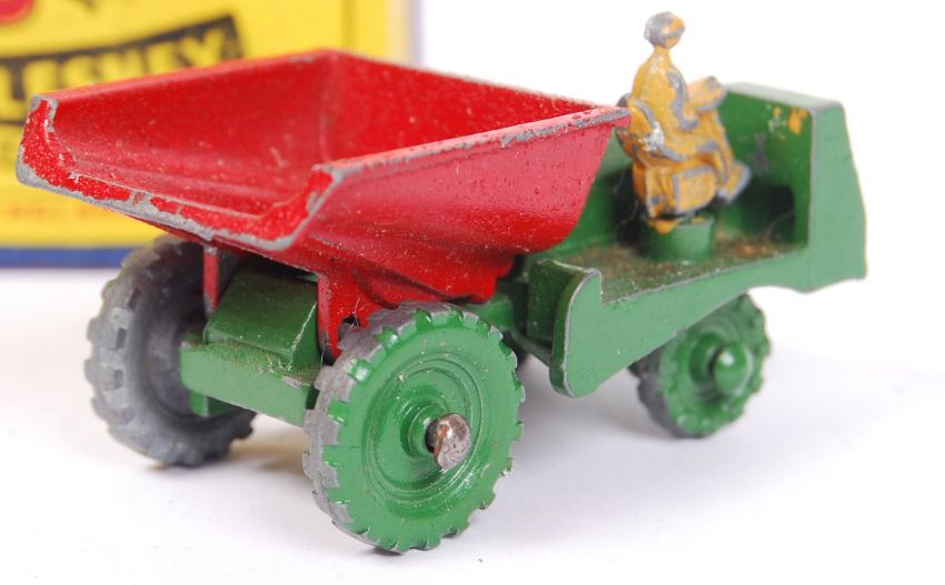 An early original vintage rare Matchbox Moko Lesney boxed diecast model No. 2  ' Muir Hill Dumper '. Green chassis, with red tipper and gold radiator, green painted wheels. Model fair+ to good, within a good original box. Rare.
